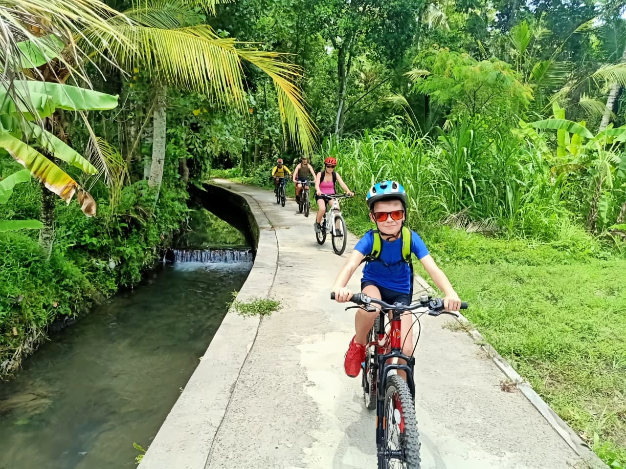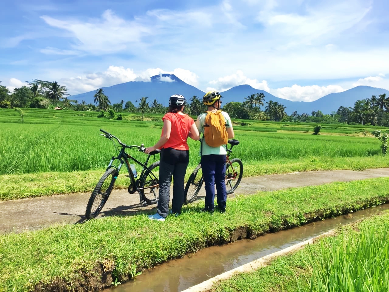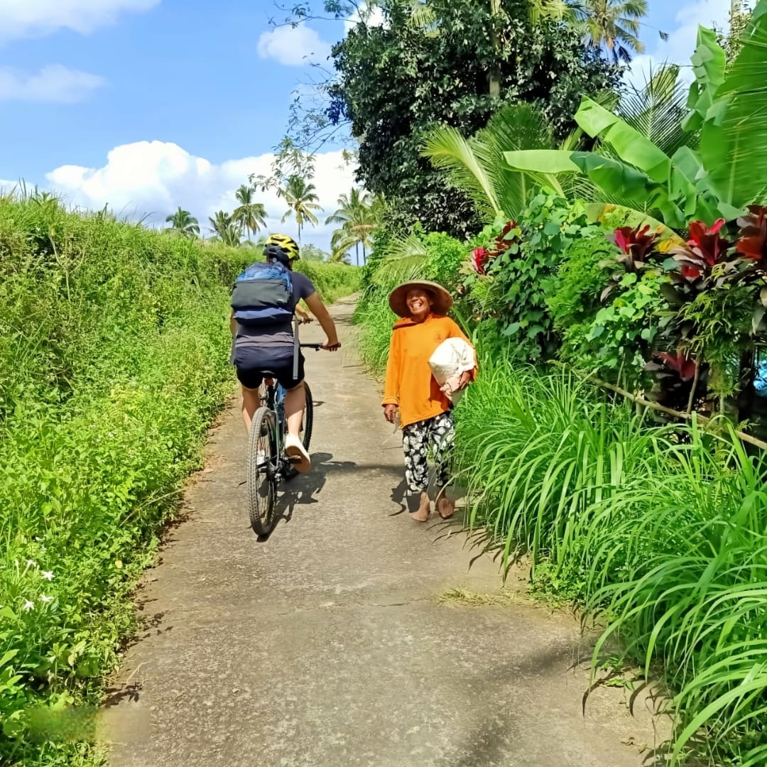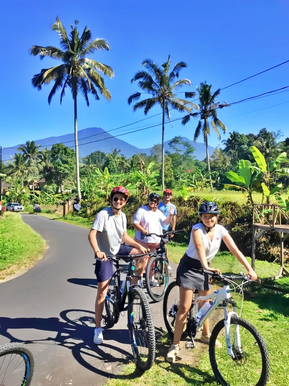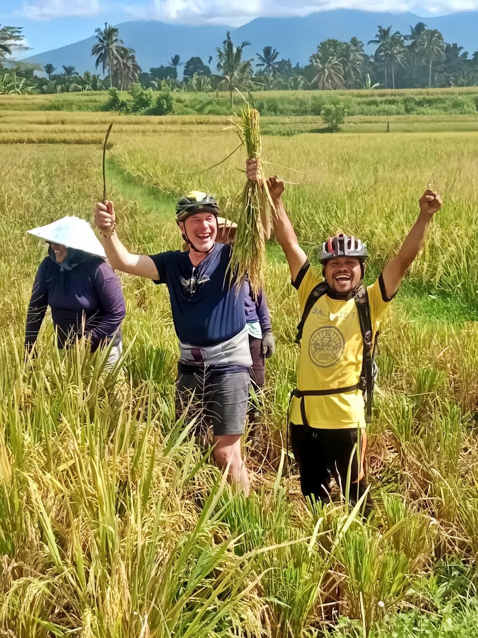 Your day will end with with an easy bike ride led by an English-speaking cycling expert, the perfect way to combine fresh air, beautiful scenery and authentic encounters. You’ll follow peaceful country trails that wind through charming villages giving you a real glimpse of everyday Balinese life. Along the way, you’ll pass endless rice terraces framed by mountains and rivers, views that are even more impressive in person. If the opportunity arises you can even step into the fields and give a hand to local farmers for a memorable, hands-on experience. Midway through take a refreshing break to enjoy a fresh coconut with a welcoming Balinese family a simple but unforgettable moment of connection. Then hop back on your bike for the final stretch leading to your reward: a delicious local dinner overlooking the rice fields, where you can relax and soak in the last light of the day.